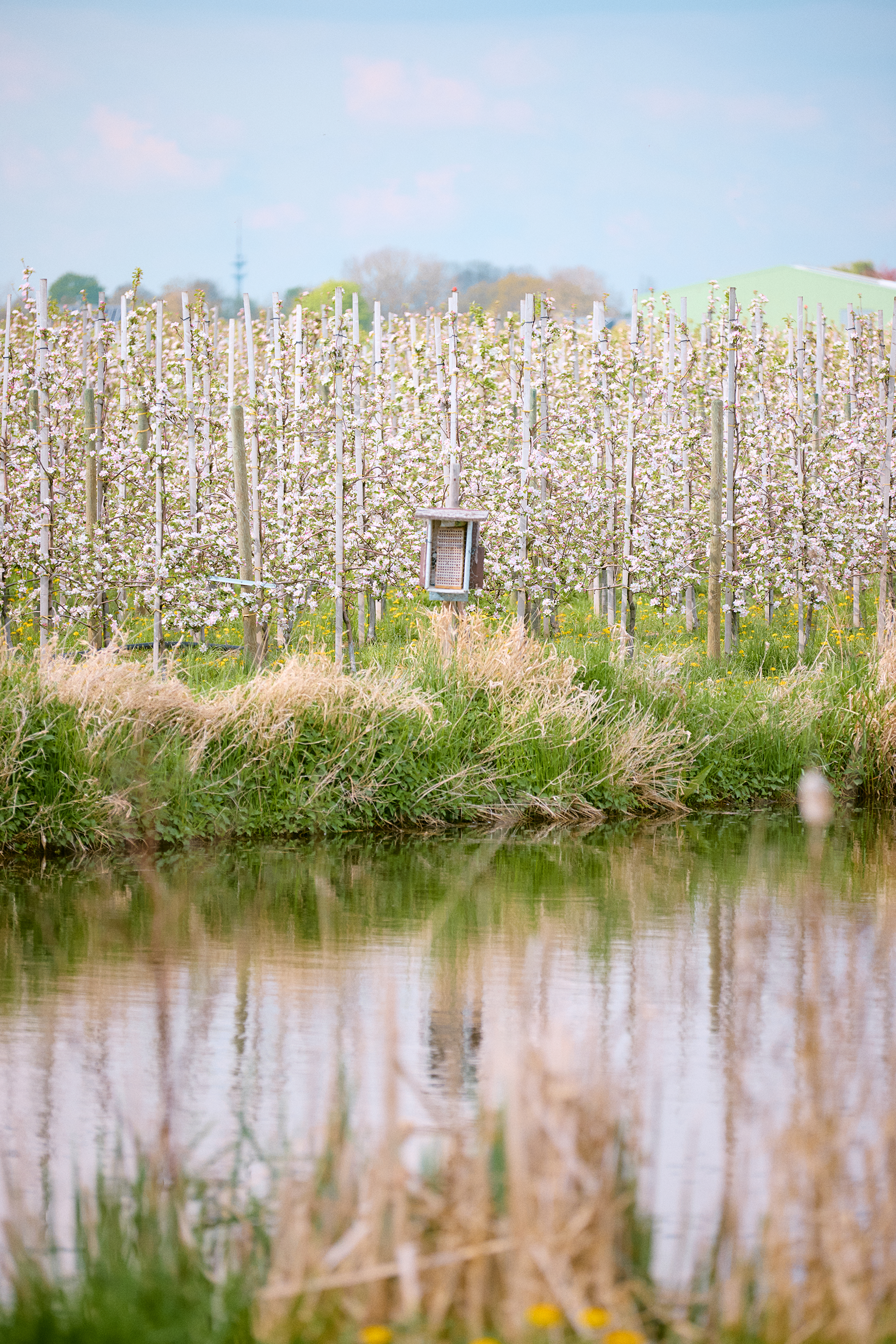 Die charakteristischen linearen Strukturen des Alten Lands prägen das Anbaugebiet seit Jahrhunderten. Schon im Mittelalter legten Siedler lange, gerade Gräben und Kanäle an, um das Land zu entwässern und urbar zu machen. Diese sogenannten Wettern verlaufen noch heute zwischen den Parzellen und ermöglichen eine effiziente Bewirtschaftung der Plantagen. Die langen Reihen der Obstbäume sind nicht nur praktisch für die Ernte, sondern tragen auch zur optimalen Bewässerung bei – beispielsweise während der Frostschutzberegnung oder zur Wasserspeicherung in Beregnungsteichen.